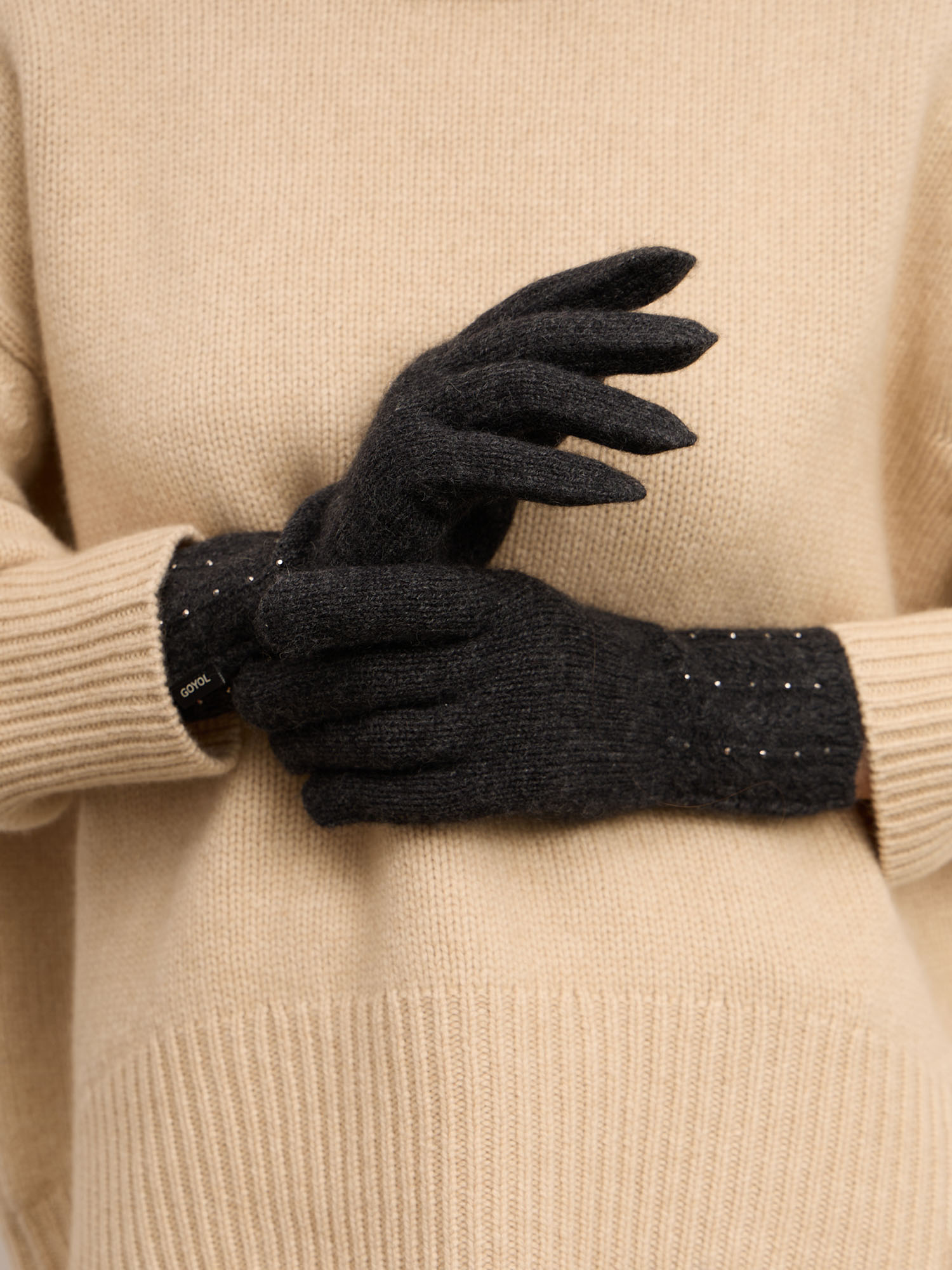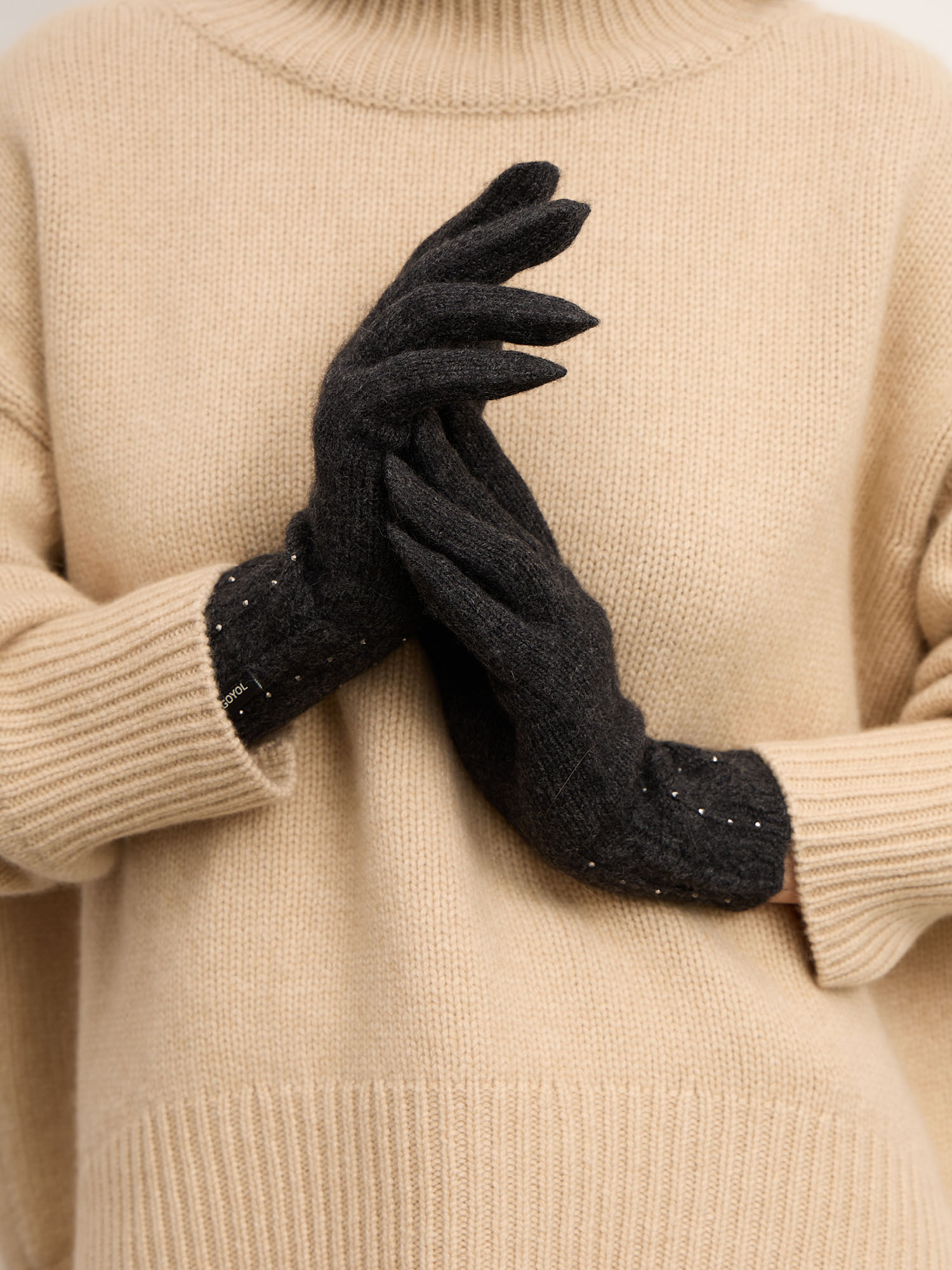 Кашемировые перчатки в оттенке антрацит — это элегантный аксессуар с выразительным характером. Глубокий темный цвет в сочетании с деликатным блеском страз делает модель стильным акцентом в образе. Они не только защищают от холода, но и добавляют утончённости, подчеркивая вкус и внимание к деталям.