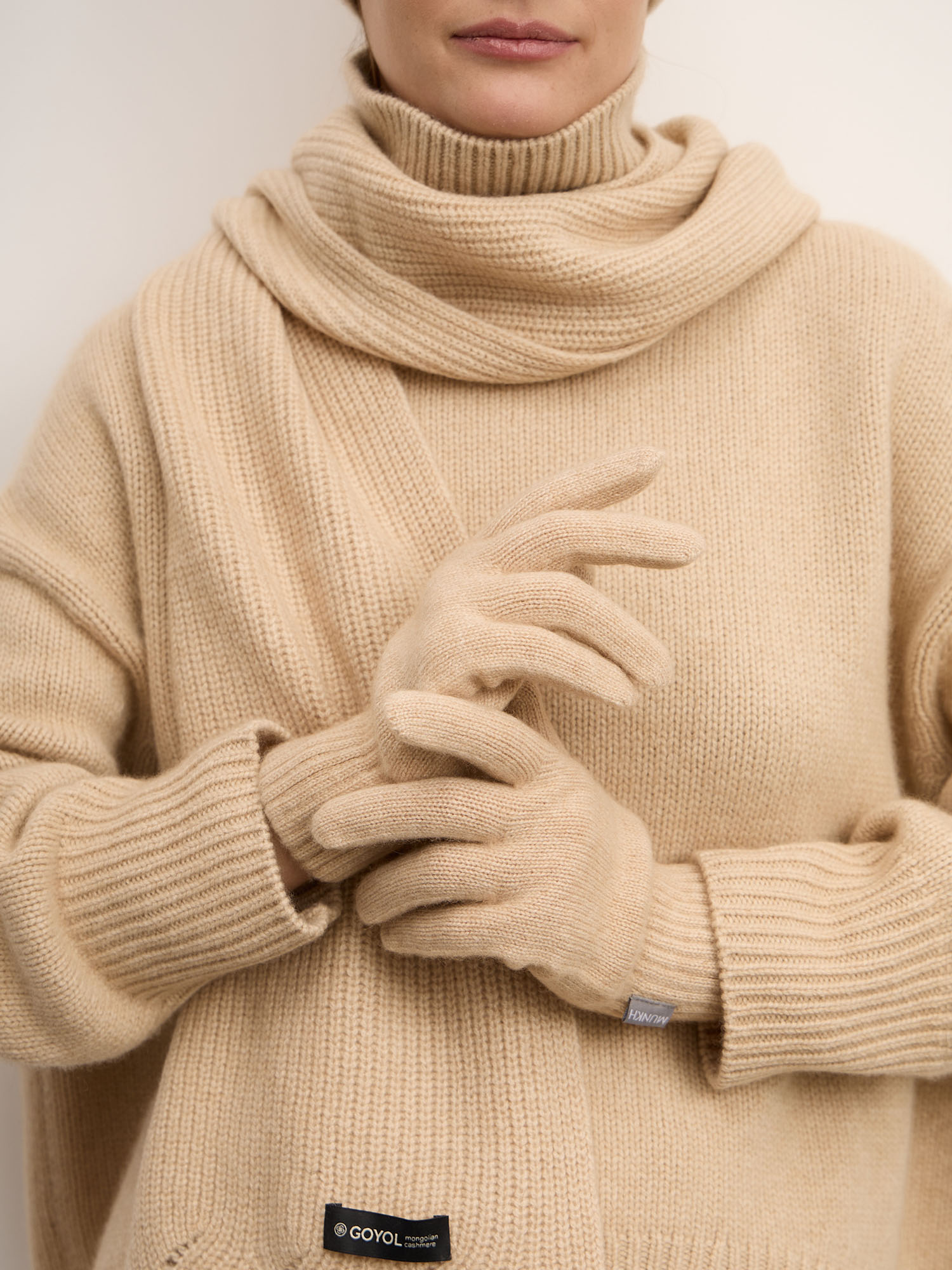 Почувствуйте прикосновение настоящего премиального кашемира. Бежевые перчатки из 100% кашемира — это не просто аксессуар, а ежедневный источник уюта и тепла. Они мягко облегают руки, словно вторая кожа, защищая от холода и сохраняя комфорт даже при длительном ношении. Идеальный баланс эстетики, функциональности и натуральной роскоши, созданный с учетом традиций обработки монгольского кашемира
