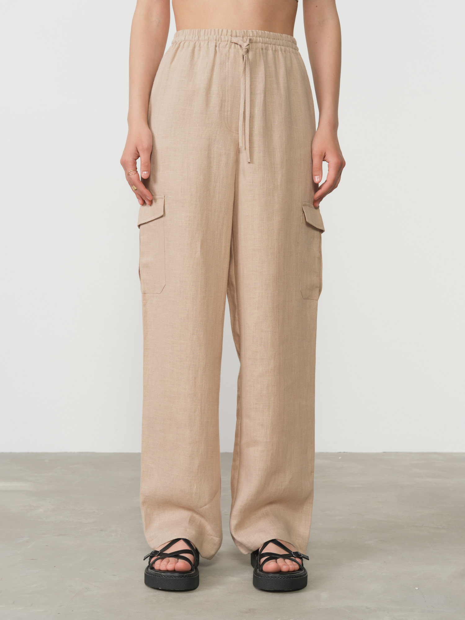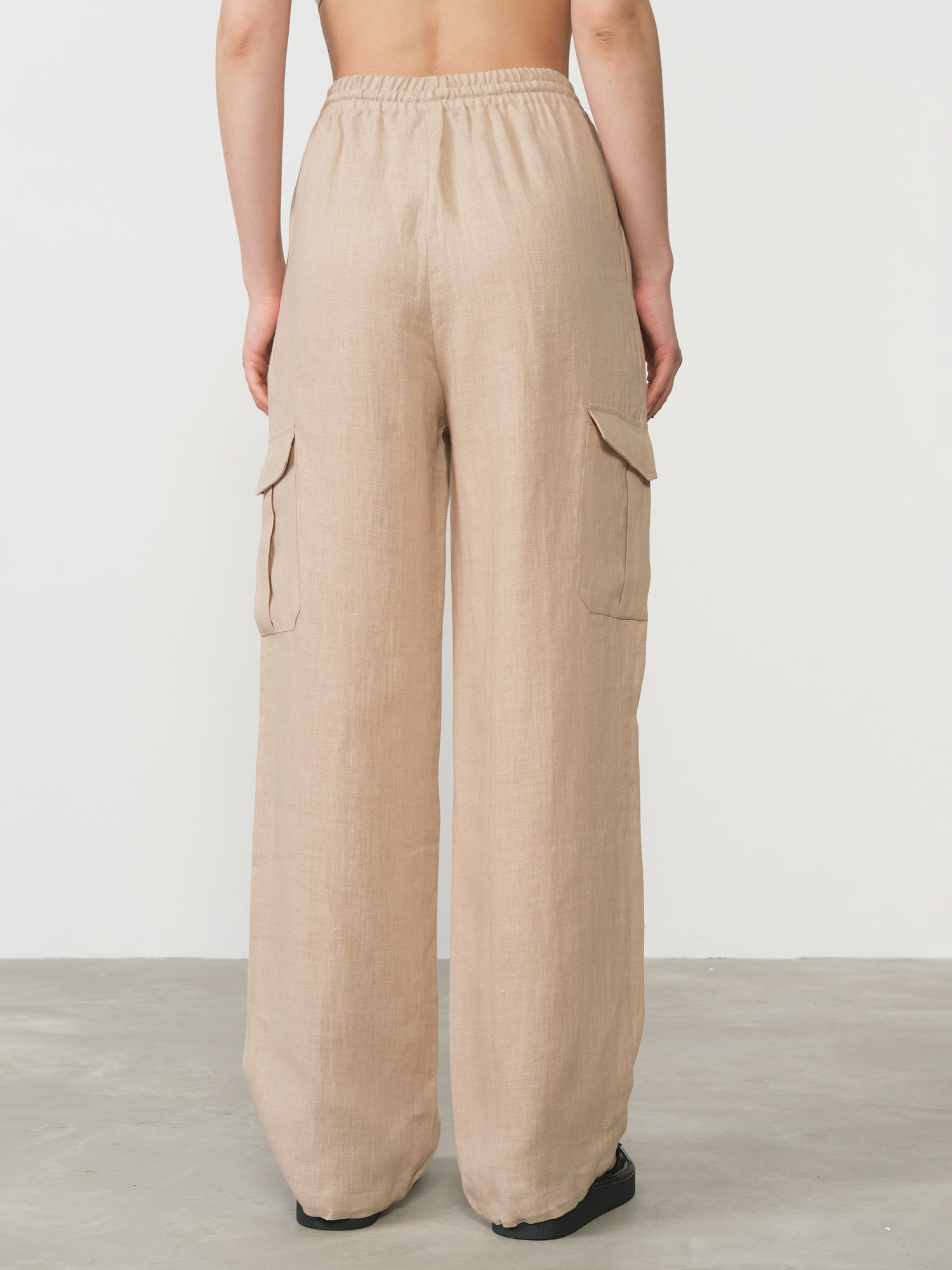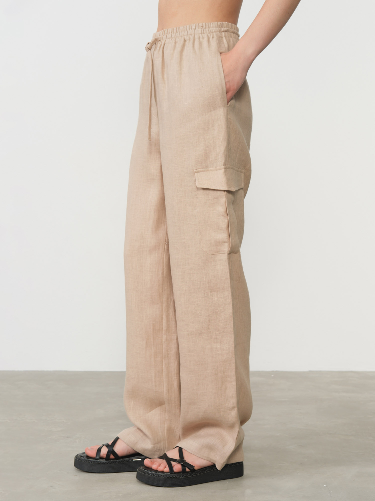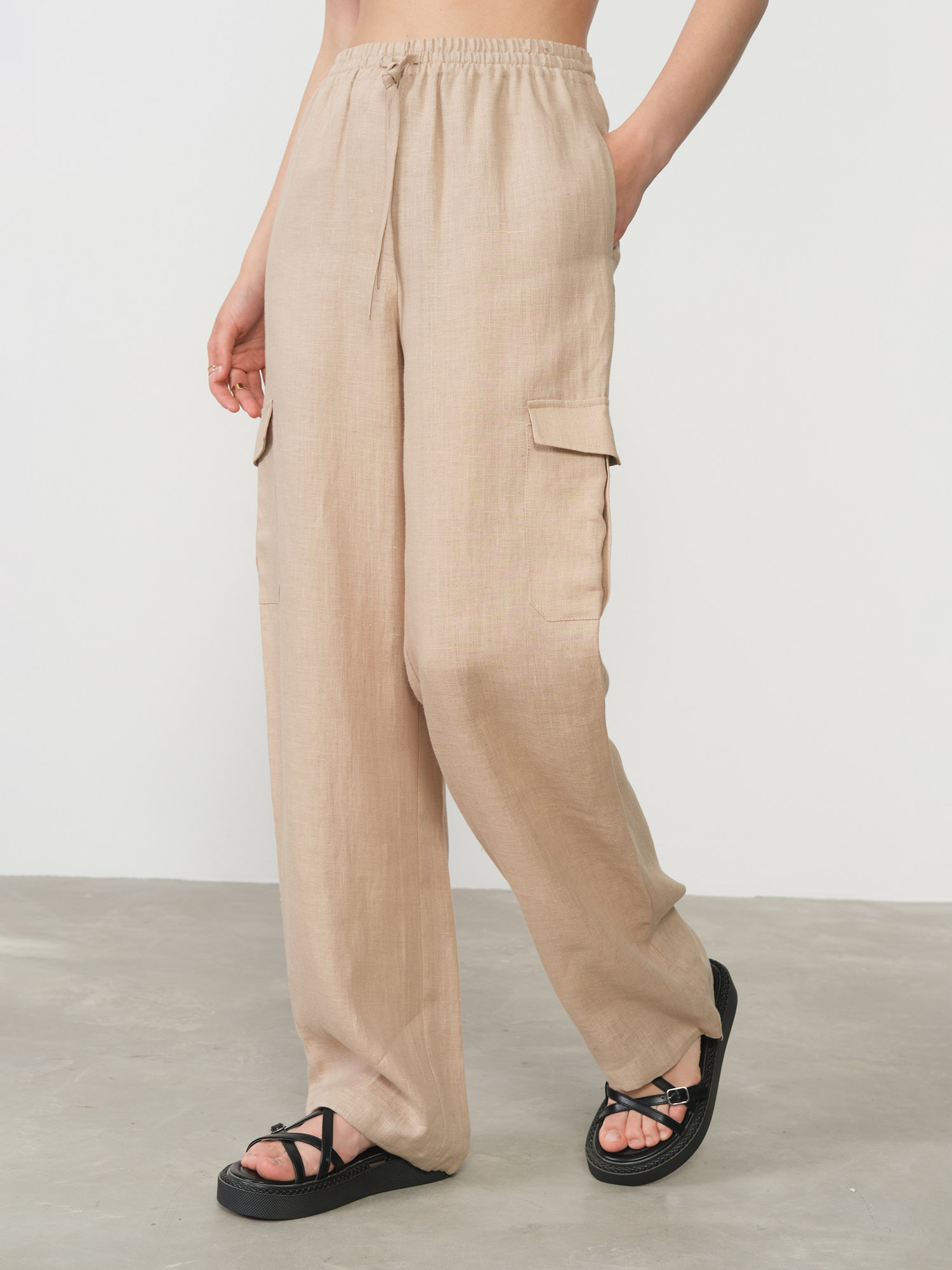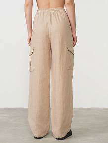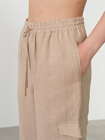 Эластичный пояс для комфортной посадки, боковые карманы, накладной карман на брючине, аккуратные швы, лёгкая фактура ткани.