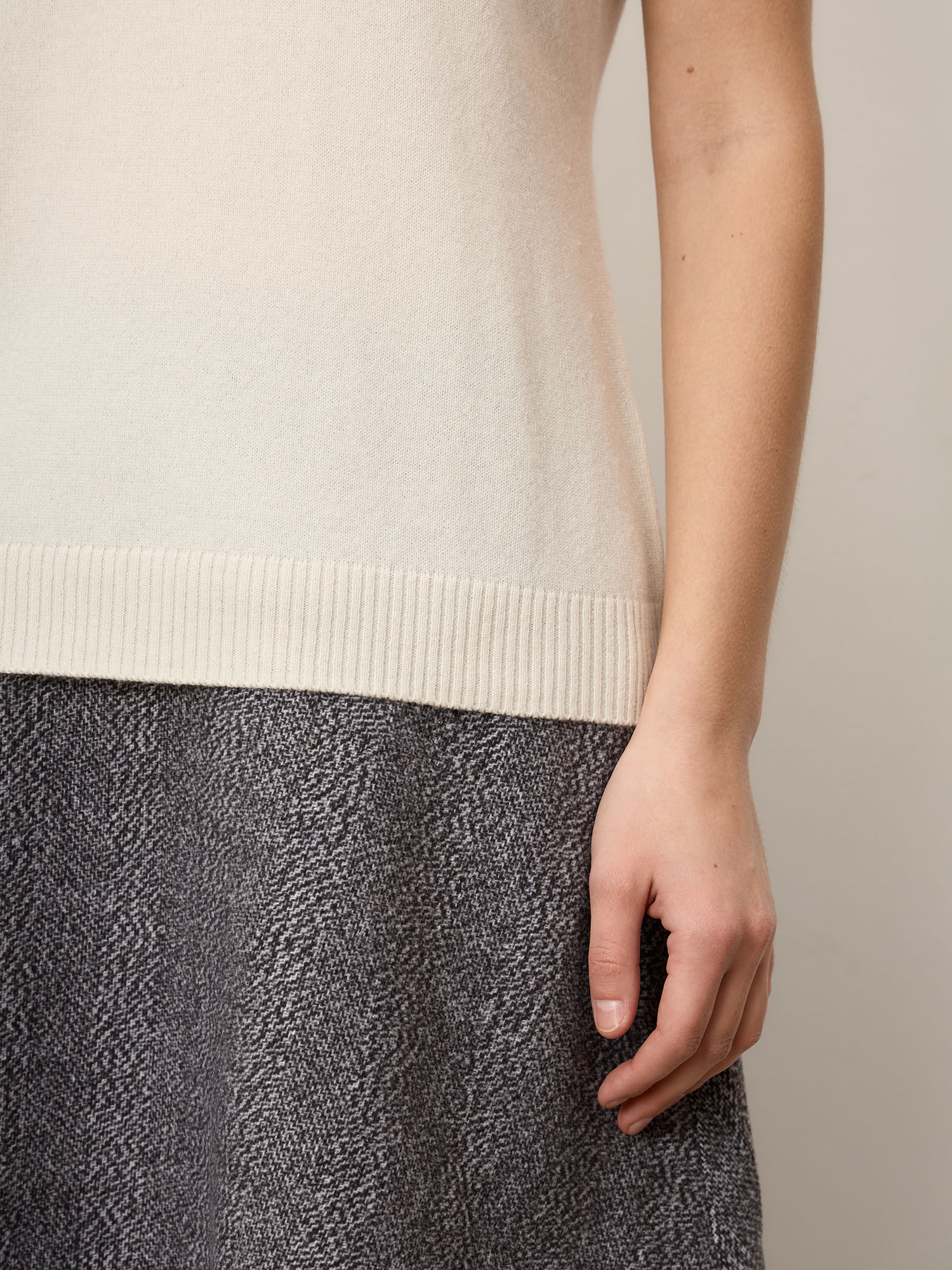 Высокий ворот для дополнительного уюта, аккуратные проймы, мягкая трикотажная фактура, эластичные края, сохраняющие форму.