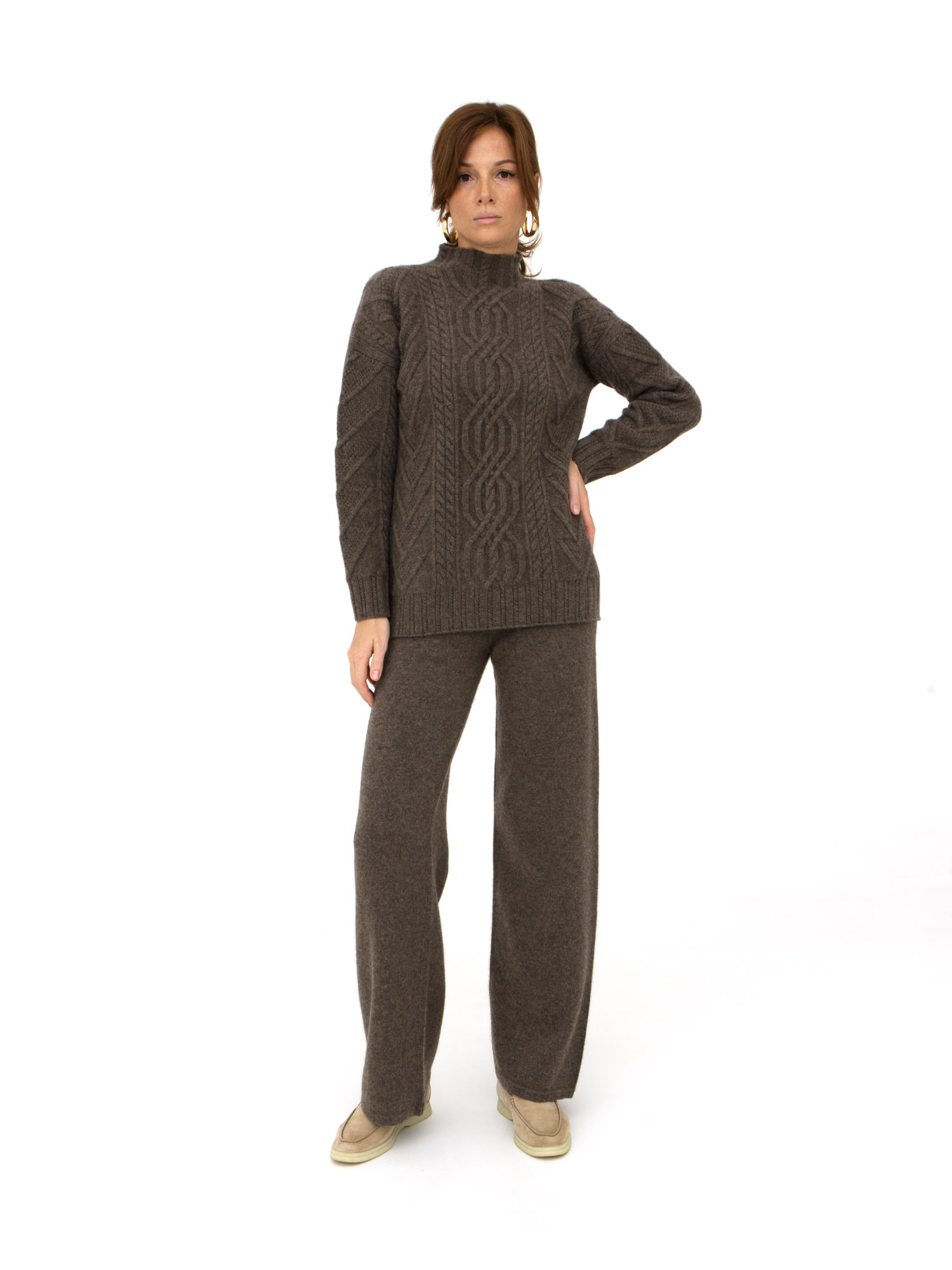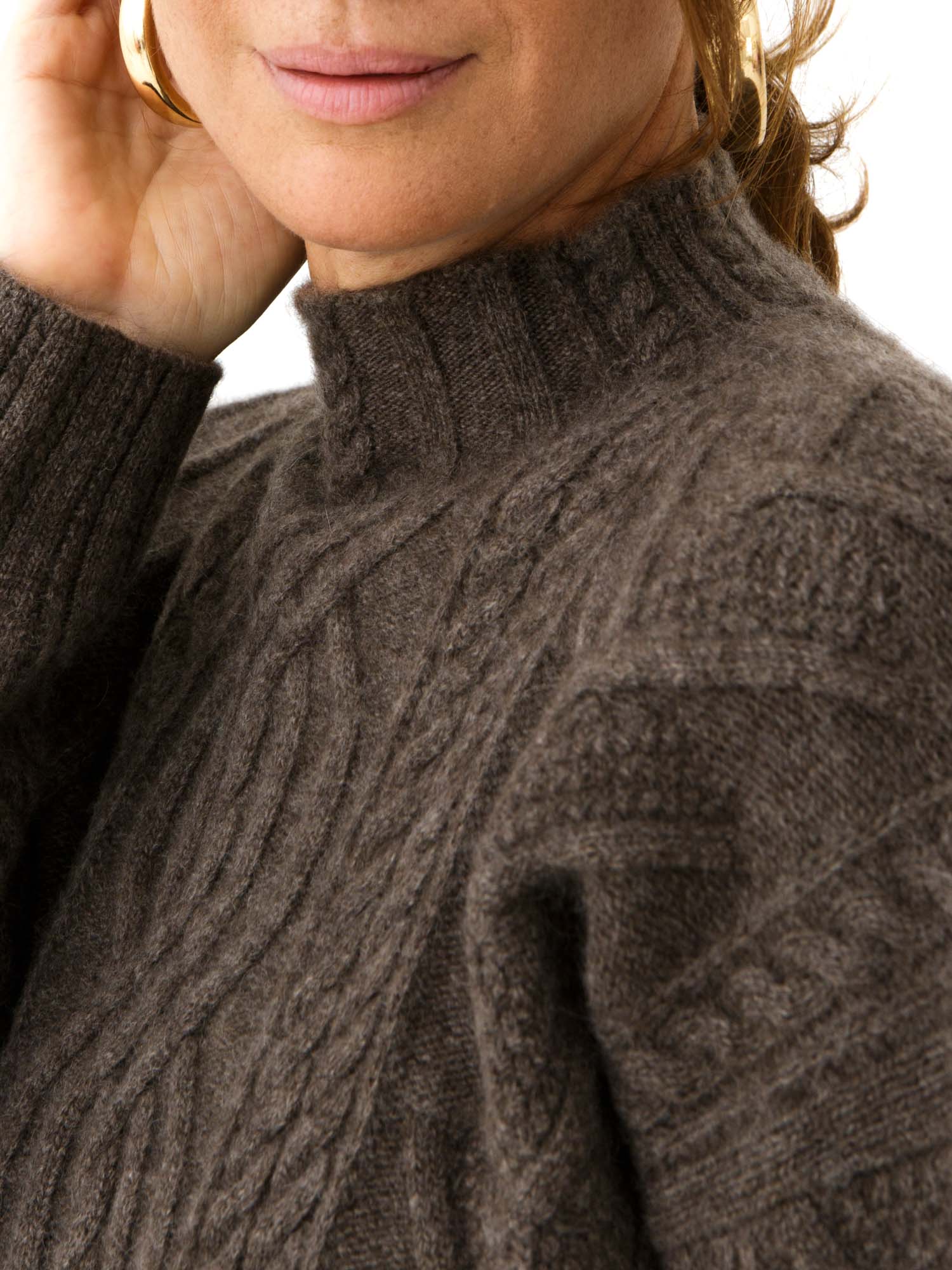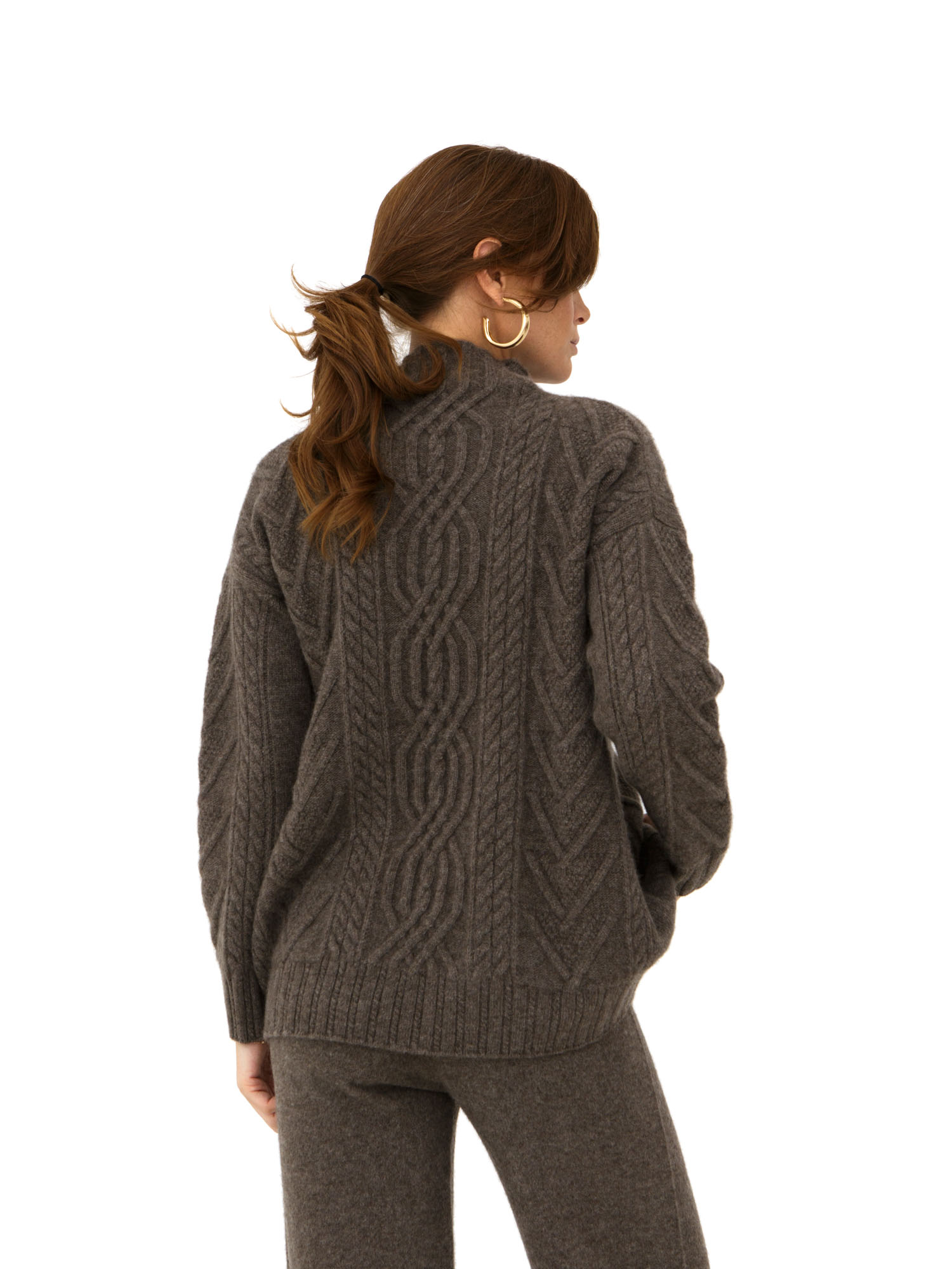 Модель выполнена с высоким воротником и украшена рельефной вязкой с косами. Фактурный узор придаёт изделию выразительность и создаёт эффект объёма, сохраняя элегантный минималистичный стиль.