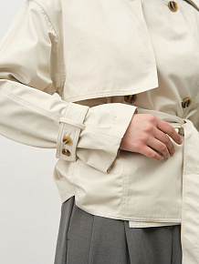 Приталенный силуэт с поясом, укороченная линия верха с декоративной кокеткой. Современная интерпретация классического тренча с выразительными элементами.